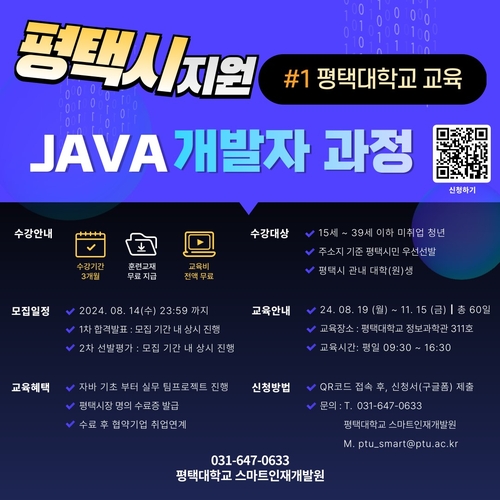 교육은 세 가지 과정이며, 평택대학교 산학협력단에서 오는 8월 19일부터 11월 15일까지 온(오프)라인 코딩 부트 캠프를 운영한다. 교육 내용은 웹 개발자 과정이다. 이 과정은 프로그래밍 언어를 활용한 웹 및 모바일 앱 개발을 배우는 과정으로 평택대학교의 교육인프라를 활용한 체계적인 교육이 이루어질 예정이며, 수료 후 협약기업에 취업 연계가 가능하다. 신청은 8월 14일까지로 평택대학교 산학협력단으로 문의(031-647-0633)하면 된다.