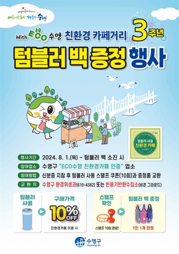 이번 행사는 친환경 카페에서 텀블러로 음료 구매 시 10% 할인을 받고 스탬프를 받아, 쿠폰(10회 스탬프)과 신분증을 지참해 수영구청 환경위생과나 빈용기반환수집소(비콘그라운드)를 방문하면 업사이클링 텀블러백과 교환해 주는 행사이다.
