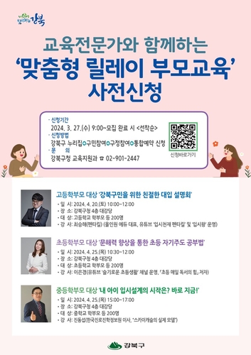 먼저 '맞춤형 릴레이 부모교육'은 ▲고등학부모 대상(4월 20일 오전 10시∼12시) ▲초등학부모 대상(4월 25일 오전 10시 30분∼12시) ▲중등학부모 대상(4월 25일 오후3시∼5시) 등 3가지 과정으로, 강북구청 4층 대강당에서 진행된다.