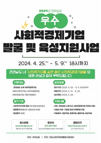 김선주 전남도 일자리경제과장은 "사회적 가치를 창출하고 특색 있는 사업으로 지역경제를 살리는 선도 기업을 발굴하고 육성해, 지역의 사회적경제 활성화를 이끌겠다"며 사회적경제 기관·단체의 많은 관심과 신청을 당부했다.