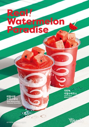 이번 신제품은 'Real!Watermelon paradise'의 주제로 여름철 인기 과일인 수박을 활용했다. 신제품은 ▲물, 시럽을 한 방울 섞지 않고 신선하고 달콤한 수박을 통째로 블렌딩한 '100% 리얼 수박주스' ▲달콤하고 부드러운 코코넛 밀크와 수박을 함께 블렌딩해 색다른 매력을 즐길 수 있는 '리얼 수박 코코넛 스무디' 2종이다.