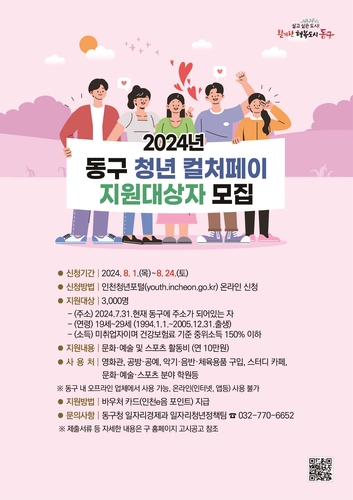 인천 동구(구청장 김찬진)는 관내 청년들을 대상으로 문화·예술 및 스포츠 활동비 10만원을 지급하는 '2024년 동구 청년 컬처페이 지원사업'을 시행한다고 밝혔다.