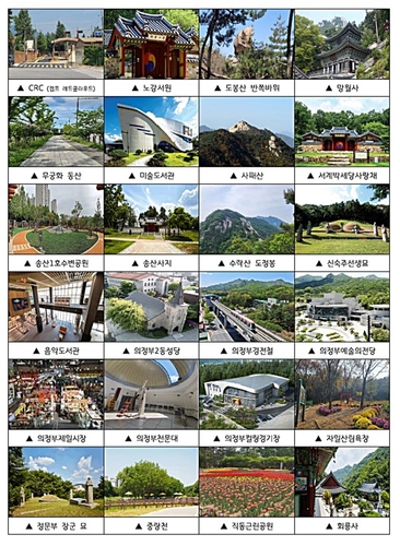 아울러 시는 이번 사업을 계기로 관내 관광명소 정립 차원에서 5월부터 시민들의 추천을 받아 ▲노강서원 ▲도봉산 반쪽바위 ▲망월사 ▲무궁화동산 ▲미술도서관 ▲사패산 ▲서계 박세당 사랑채 ▲송산1호 수변공원 ▲송산사지 ▲수락산 도정봉 ▲신숙주 선생 묘 ▲음악도서관 ▲의정부2동 성당 ▲의정부경전철 ▲의정부예술의전당 ▲의정부제일시장 ▲의정부천문대 ▲의정부컬링경기장 ▲자일산림욕장 ▲정문부 장군 묘 ▲중랑천 ▲직동근린공원 ▲회룡사 ▲캠프 레드클라우드(CRC) 등 총 24개소의 명소를 정했다.